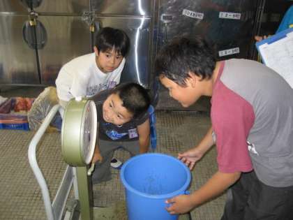 給食委員が,ご飯やおかずの残量を量り,何人分残ったかを換算します。