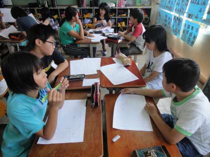 国語科では,修学旅行のパンフレットを製作しています。各グループに分かれて『編集会議』を何度も行い,記事の内容を試行錯誤しています。今回は,パソコンを使い製作するので,それも楽しみの1つです!