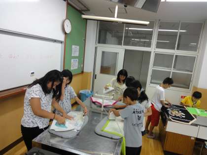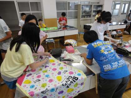 家庭科の学習でエプロンをつくっています。自分の身長に合わせて,すその長さを調節しながら,布を切りました。二人組で教え合いながら,アイロンをあてるところまで出来ました。次の時間からはいよいよミシンです。5年生のときの学習を生かして,頑張りましょう。