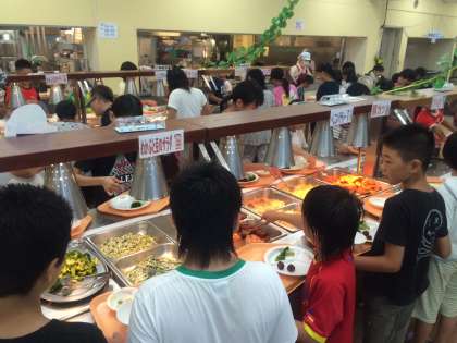 自然の家の食事はバイキングです。八田先生から教わった通り栄養のバランスを考えて選んでいます。