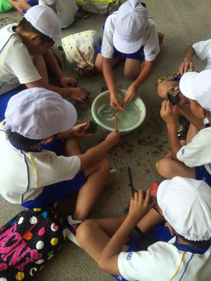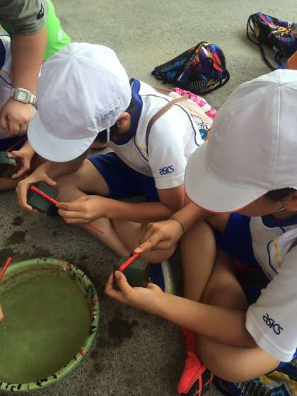 キラキラきれいな貝がらが出てくるまでお箸を磨きます。