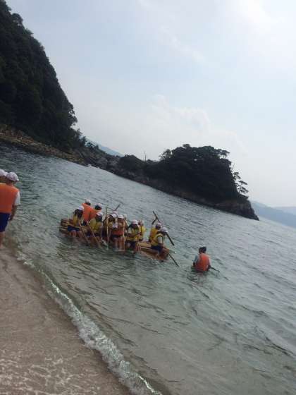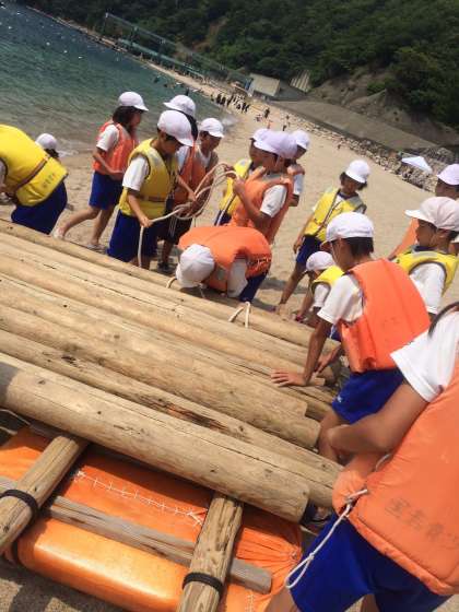 みんなで力を合わせて縄を引っ張り丸太を縛ります。