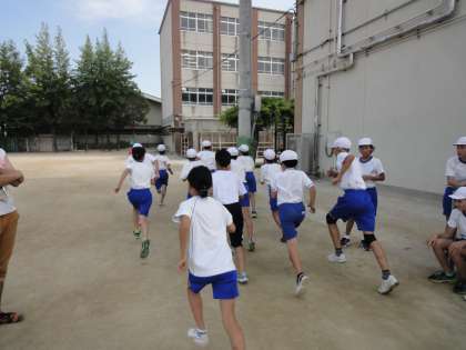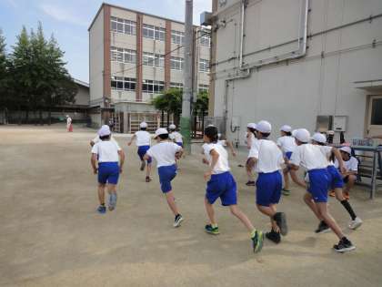 暑い運動場を元気よく走っています。今日は1.6kmを走りました。みんな顔を真っ赤にして頑張っていました。