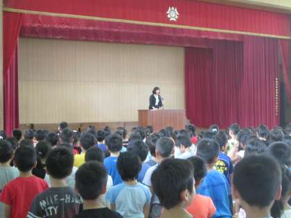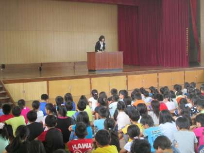 1時間目の朝会では,校長先生から夏休み中の話や,運動会に向けてのお話がありました。