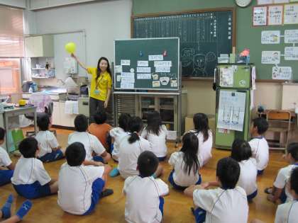 測定前の保健指導で5,6年生は,風船を用いながらストレスの対処法について学びました。実際に目をつぶって音楽をかけ腹式呼吸も行いました。