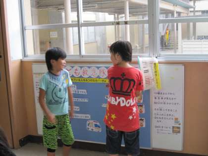 子どもたちは,電話で119番通報する人と,消防署の人に分かれて,やりとりを練習しています。