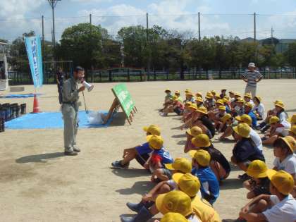 国土交通省淀川河川事務所,河川レンジャー,伏見消防署神川出張所の方に来ていただき,防災体験学習を行いました。子どもたちは,三つの体験をしました。