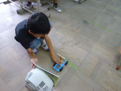 実験をしてみると強い風では,勢いよく遠くまで走りました。予想通りの実験結果になりました。