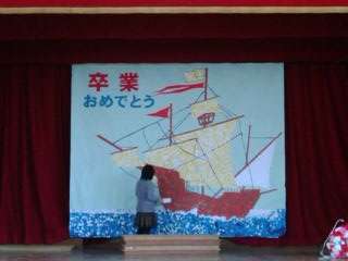 体育館の舞台には,卒業,そして中学生という大きな航海へと旅立つ