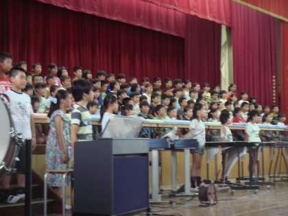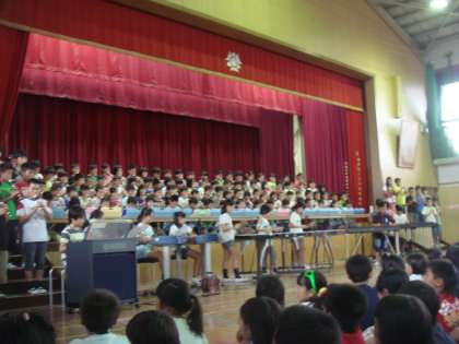 前期終業式の後に4年生の発表がありました。子どもたちは夏休み前からこの日のために一生懸命練習してきました。本番は緊張もありましたが練習の成果を出すことができました。他の学年の児童から「とてもきれいな演奏でした。」などと感想をもらいました。4年生本当によくがんばりました。