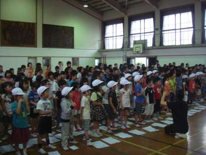 運動会に向けて応援練習が始まっています。今日は白組の応援練習がありました。応援団の5・6年生が中心となって練習します。4年生も大きな声を出してがんばりました。