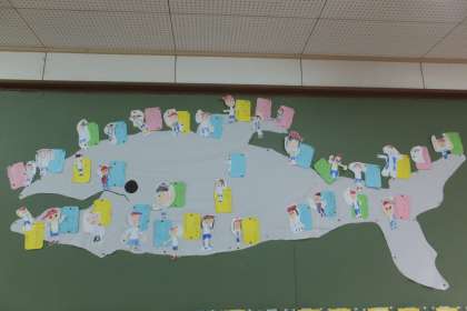国語科「くじらぐも」の学習は,毎日とても楽しいです。今日はみんなで,くじらぐもと空の旅に行きました。どんなお話をしているのか,一人一人実際にお話ししてみました。みんな違うことを話しかけていました。子ども達の想像力は素晴らしいです。