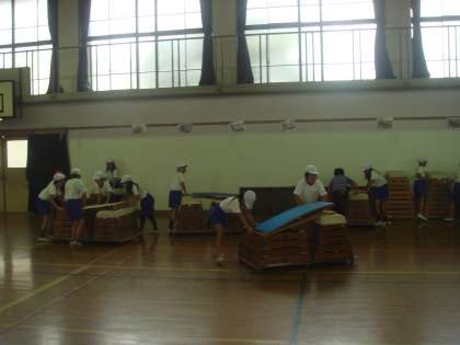 体育科の学習で「とび箱運動」が始まりました。今日は場の作り方や安全について学習し,後半は自分のできる技を確認しました。3年生での学習を思い出し,スムーズに準備することができました。