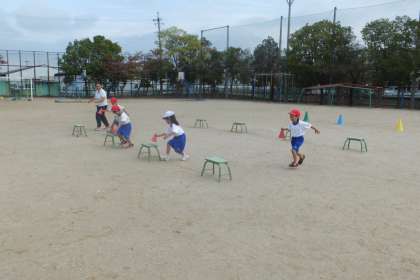 今日から,体育で「リレー遊び」の学習が始まりました。まずは,コーンを回る練習,タッチをして順番に走る練習などをしました。その後,「置きかえリレー」をしてみました。台に置いてある物を次の台に運び,コーンを回ってバトンタッチしていきます。子どもたちは,とても楽しそうに学習に取り組んでいました。