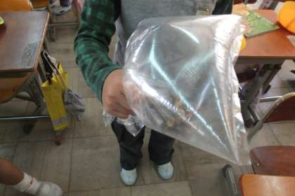 生活科で見つけに行ったどんぐりをたくさん集めて,袋に入れている人が何人かいました。そこで,袋を結んでいるとあることに気付いたようです。「先生!!もしかして,このどんぐり,この前音楽で勉強した楽器を作れるかもしれへん!!ほら,聴いてみて・・・♪」と,袋を振ってくれました。すると素敵な秋の音色がしてきました。子ども達は色々な発見をしてくれます。