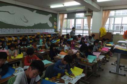 今日は,楽しみにしていた遠足でしたが天気が悪く,延期になりました。そのため,通常通り授業をしました。子どもたちは,集中して一日頑張っていました。図画工作科の学習では画用紙を使って,プレゼントの箱を作りました。順番に折ったり,貼ったりしていくと,どんどん一枚の紙が箱に変化していき,驚きの声があがていました。