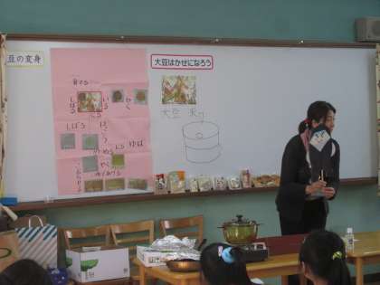 栄養教諭の八田先生による食の指導で,大豆のひみつについて学習しました。