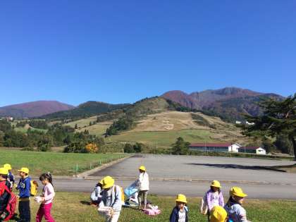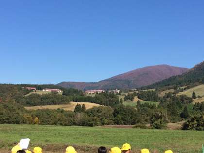 お弁当はきれいな景色を見ながら食べます。斜面には牛の模様に草が刈られたところもあります。