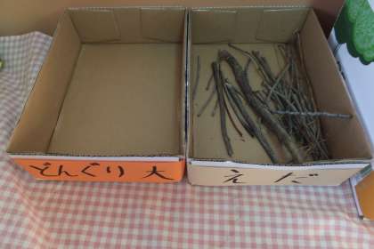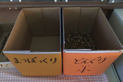 生活科の学習で,秋見つけをし,見つけたもので何かを作ろうということになりました。子どもたちからは「楽器」・「絵」・「飾り」・「首飾り」・「こま」・「ロボット」など,他にもたくさん作れそうなもののアイディアが集まりました。作るために,まずは材料集めです。毎日拾ってきては教室の箱に入れてくれています。