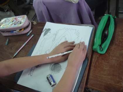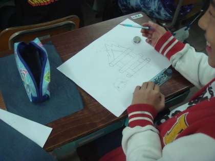 図画工作科の授業では版画の学習に入りました。宿泊学習でのキャンプファイヤーの様子を版画で表します。まず,下絵をしっかりと描いています。