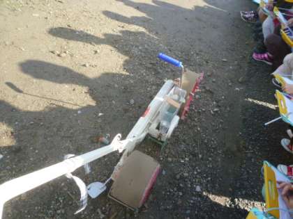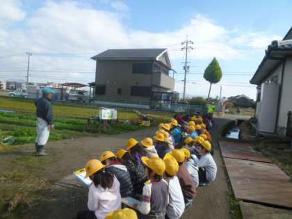 種まきの機械を実際に見ました。子ども達は「自転車みたいな機械だ。」や「種が畑にどんどん落ちていく。」など感想を述べていました。
