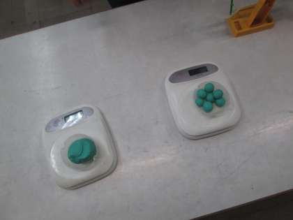 粘土を使った実験では,ものは,形を変えたり,小さくちぎったりしても重さは変わらないことがわかりました。