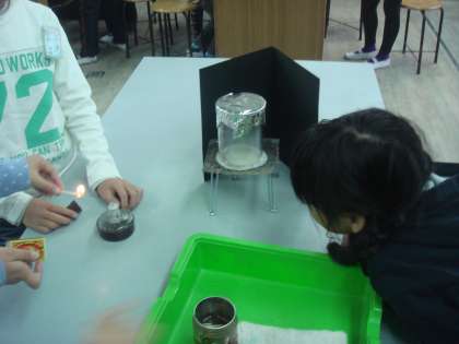 空気をあたためるとどういう動きをするかを実験で調べました。空気の動きは目で見えないので,ビーカーにけむりを入れてけむりの動きを見ました。