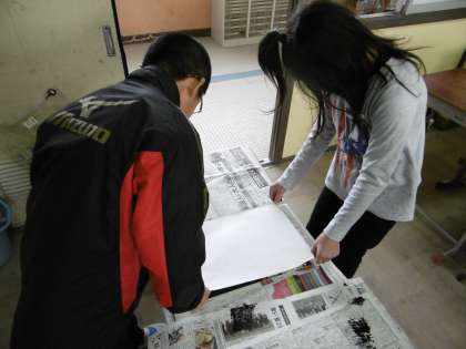 ローラーでインクをつけた後,友達と協力しながら紙をおきます。
