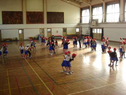 体育の時間に,"からだほぐし"を行いました。3人組や5人組,10人組などを子どもたちが自分でつくり,おしくらまんじゅう や なべなべそこぬけをしました。みんなで協力してグループをつくり、楽しく活動していました。子どもたちの笑顔がキラキラと光り とても素敵でした。