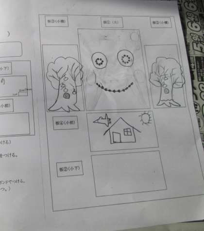 1時間目に設計図を描いて,どの木がどの部分になるのかをよく考えてから,彩色しています。