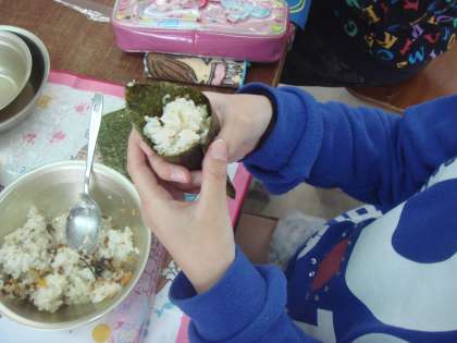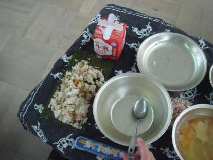 今日の給食は手巻きずしでした。自分でのりを巻いて楽しくいただきました。とてもおいしかったです。