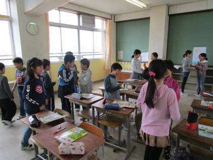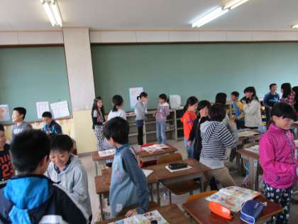 英語であいさつや自分の名前を言う学習でした。いろいろな子とあいさつをして楽しみました。