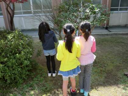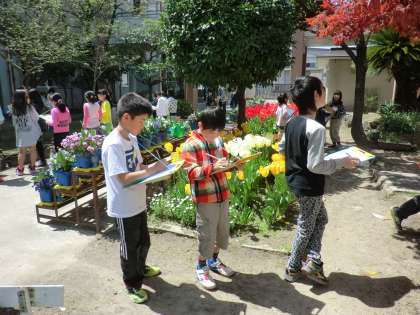 とても心地よい春の陽気の中,子どもたちは中庭の木を観察しました。気温を測り,木の葉の大きさや形に気をつけて絵に描きました。