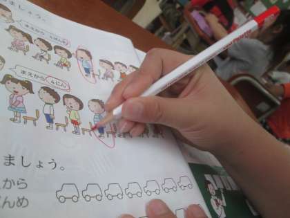 算数の「なんばんめ」の学習では,「○番目」と「○人」という言葉から,順序数と集合数との違いを考えています。