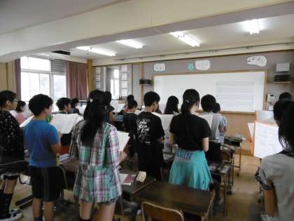 修学旅行の平和集会に向けて「折り鶴」の歌の練習を始めました。