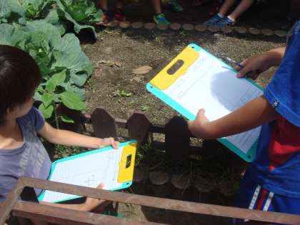 ホウセンカの子葉が出てきたので,観察しました。高さや色,形,葉の枚数などを調べました。