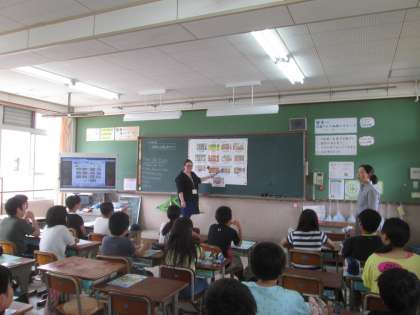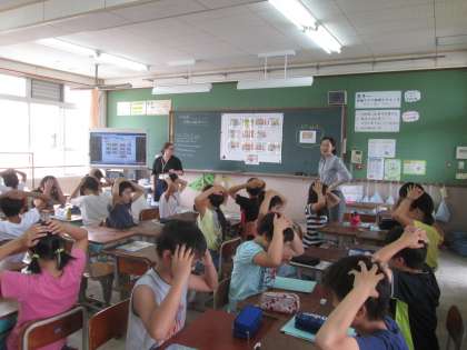 「道案内をしよう」の学習で,建物の言い方を知り,絵カードをみながら様々な種類のゲームをしながら外国語に親しみました。