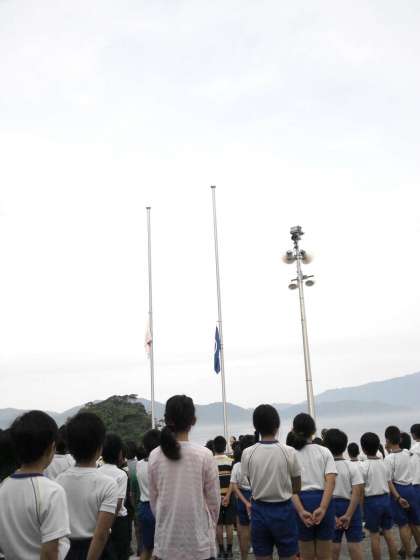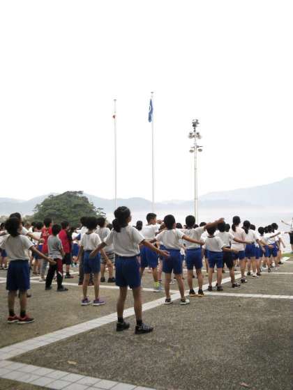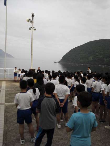 朝の集いの様子です。 一緒に宿泊している学校と合同でおこないます。