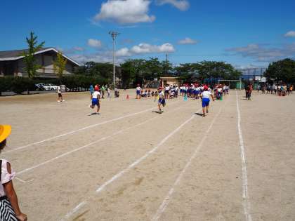 中間休みにクラス全員でリレーをしました。勝利に向かって団結しながら,楽しく取り組みました。