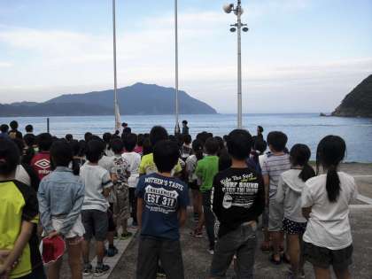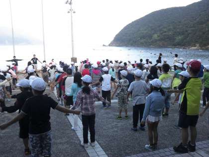 朝の集いの様子です。一緒に宿泊している大学生の団体と合同でおこないます。一緒にゲームもしました。