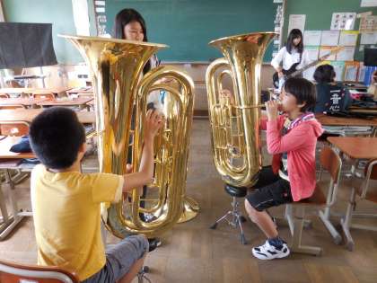 パートに分かれて基礎練習や楽器のメンテナンスの方法を優しく教えてもらいました。
