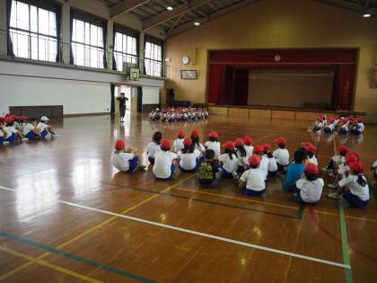 運動会の学年練習がいよいよ始まりました。3年生の団体競技は,「羽束師タイフーン(台風の目)」です。今日は,競技のルールと注意事項の確認,チームごとに分かれて並び方の確認をしました。チームで力を合わせて頑張っていってほしいと思います。
