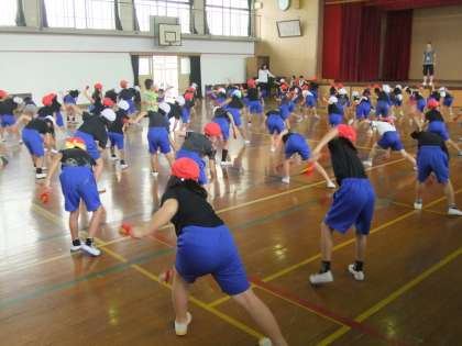 体育の時間に,10月10日の運動会で発表する「よさこいエイサー」の練習をがんばっています。鳴子の音と子どもたちの元気な掛け声が,体育館に響きました。