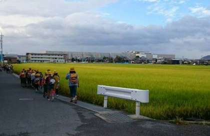 朝,校区を見回りしていると,収穫を迎えた稲穂の側を,黄色い帽子をかぶって高学年生を先頭に並んで歩く本校児童の集団登校の様子がありました。