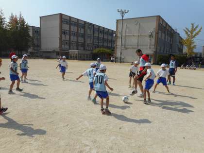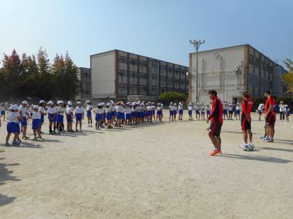 京都パープルサンガで実際に活躍されている選手、コーチの方々にサッカー教室を開いて頂きました。選手によるシュートやリフティングのデモンストレーションを見たり、選手と一緒にミニゲームすることができ、子ども達も目を輝かせながら参加していました。サッカー教室の後には、教室で一緒に給食を食べることもできました。子ども達にとって本当に貴重で楽しいひと時となりました。