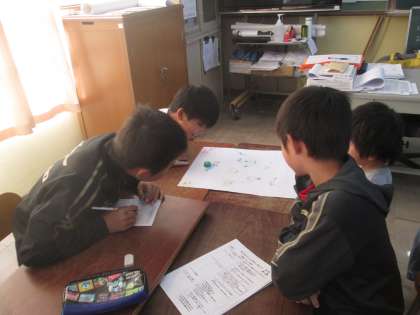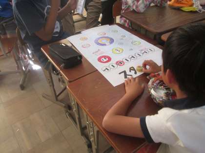 6年生が作ってくれたシートの中にある的をペットボトルキャップで狙います!