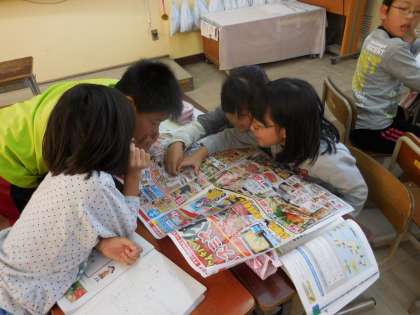 社会科「商店のはたらき」の学習で,スーパーなどで販売されている品物の産地調べをしました。スーパーに買い物に行ったときに産地をメモしたものや,お家にあったチラシをを持ち寄ってグループで産地調べをしました。