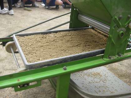 苗箱に機械を使って,種もみをまきました。