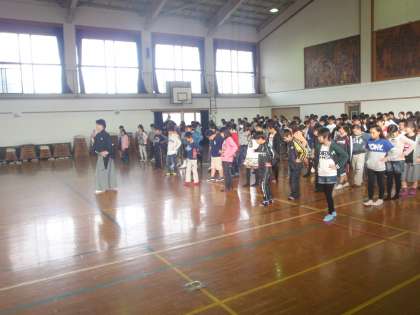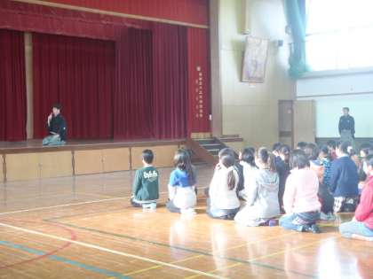 9日(水)の5・6校時,2月に予定している文化芸術体験に向けてのワークショップがありました。2名の狂言師の先生に来ていただき,前半には声の出し方や歩き方,正座の仕方といった基本的なことについて。後半は,「附子(ぶす)」というお話の一部分の練習をしました。