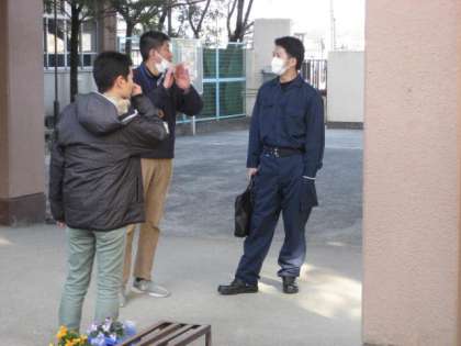 話をしながら,不審者を落ち着かせ,一室に入れ込む。